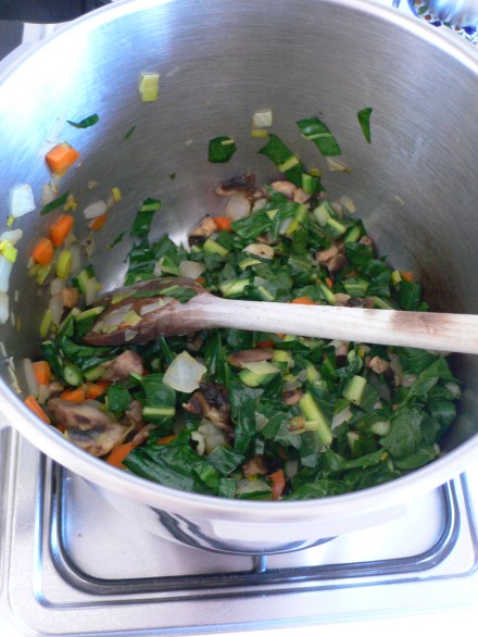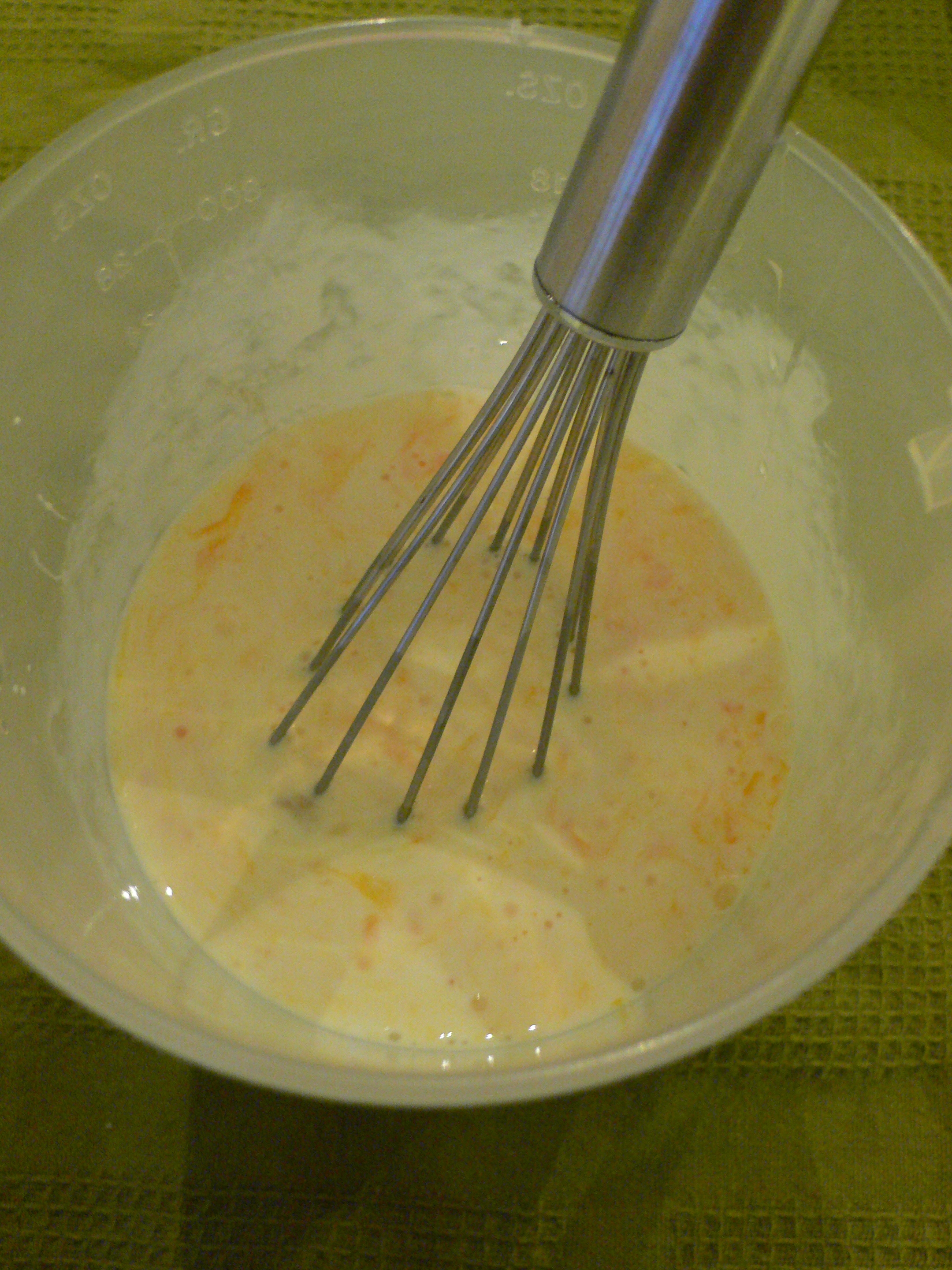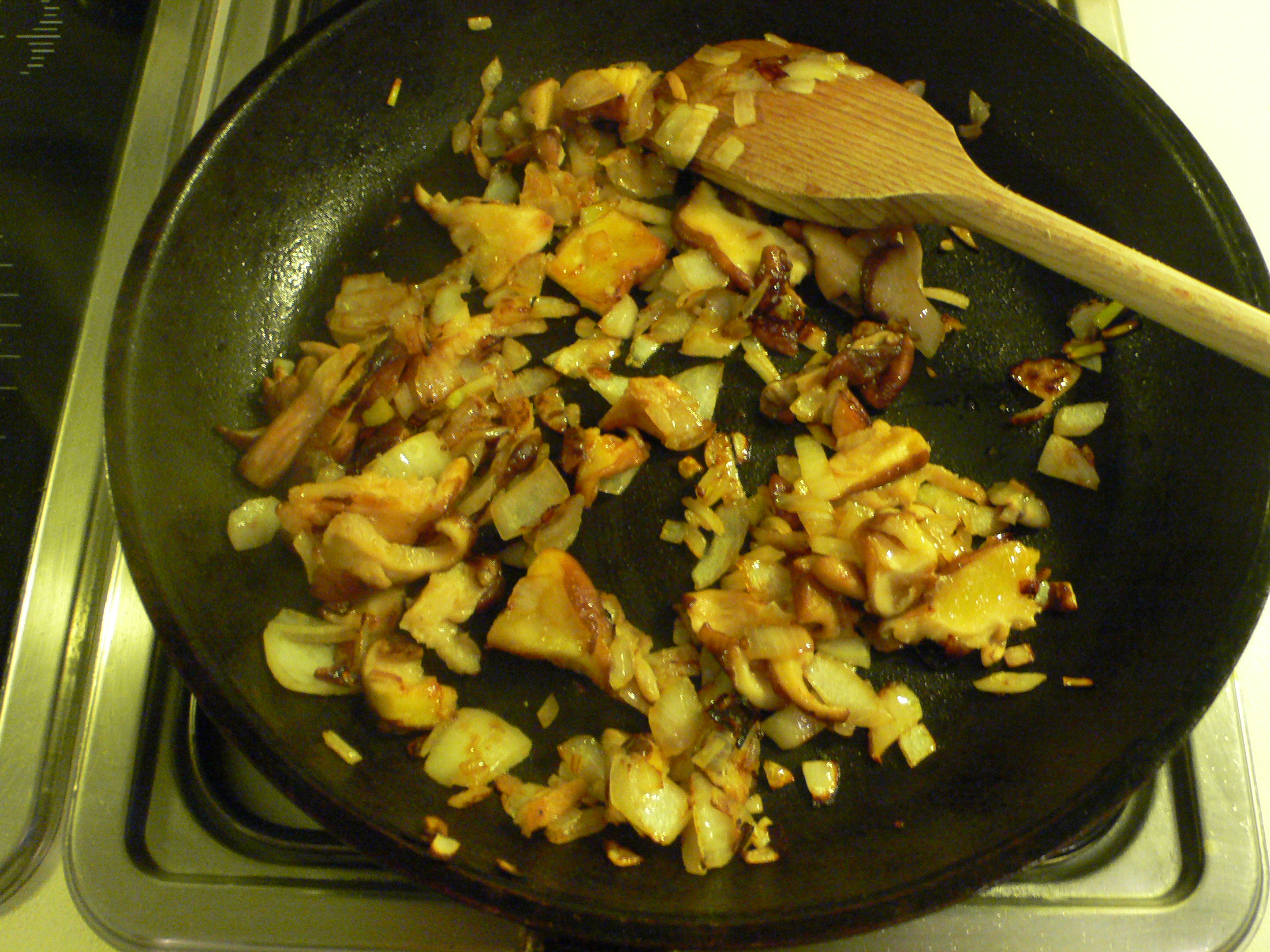 Mientras se cocía un poco la masa, cociné la cebolla con los champiñones y mezclé la nata con los huevos: