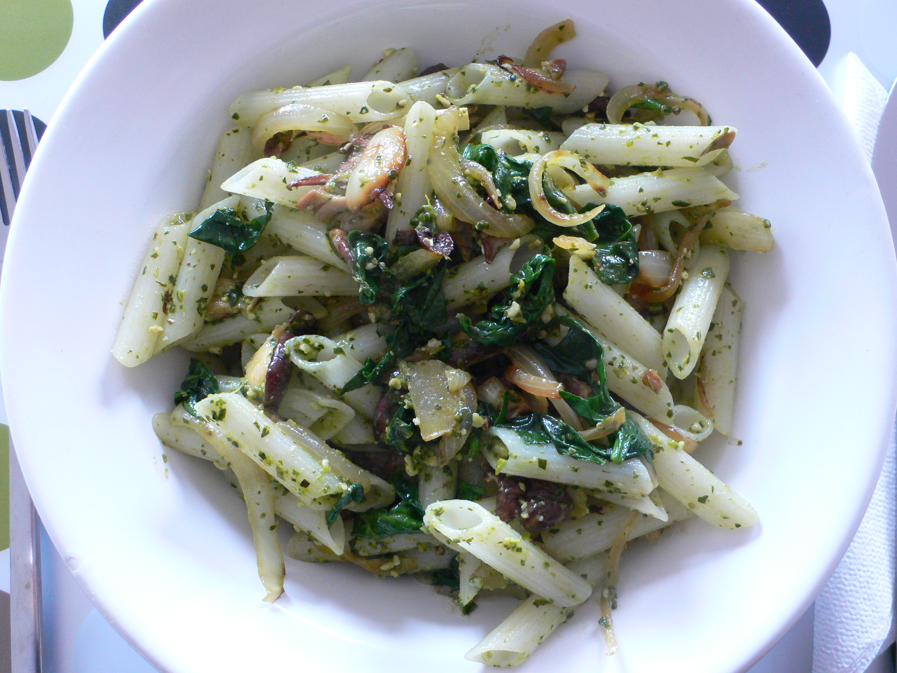 Está buenísimo y es más ligero que el pesto convencional, no tan seco en la boca. Y se lo podéis poner a todo: pasta, tostadas con un poco de tomate y queso. Yo lo he usado para animarme una menestra de lo más sosa y para preparme un delicioso plato de pasta (de harina de arroz ¿eh? no vayáis a pensar que me estoy saltando el detox) con setas, espinacas y cebollas: