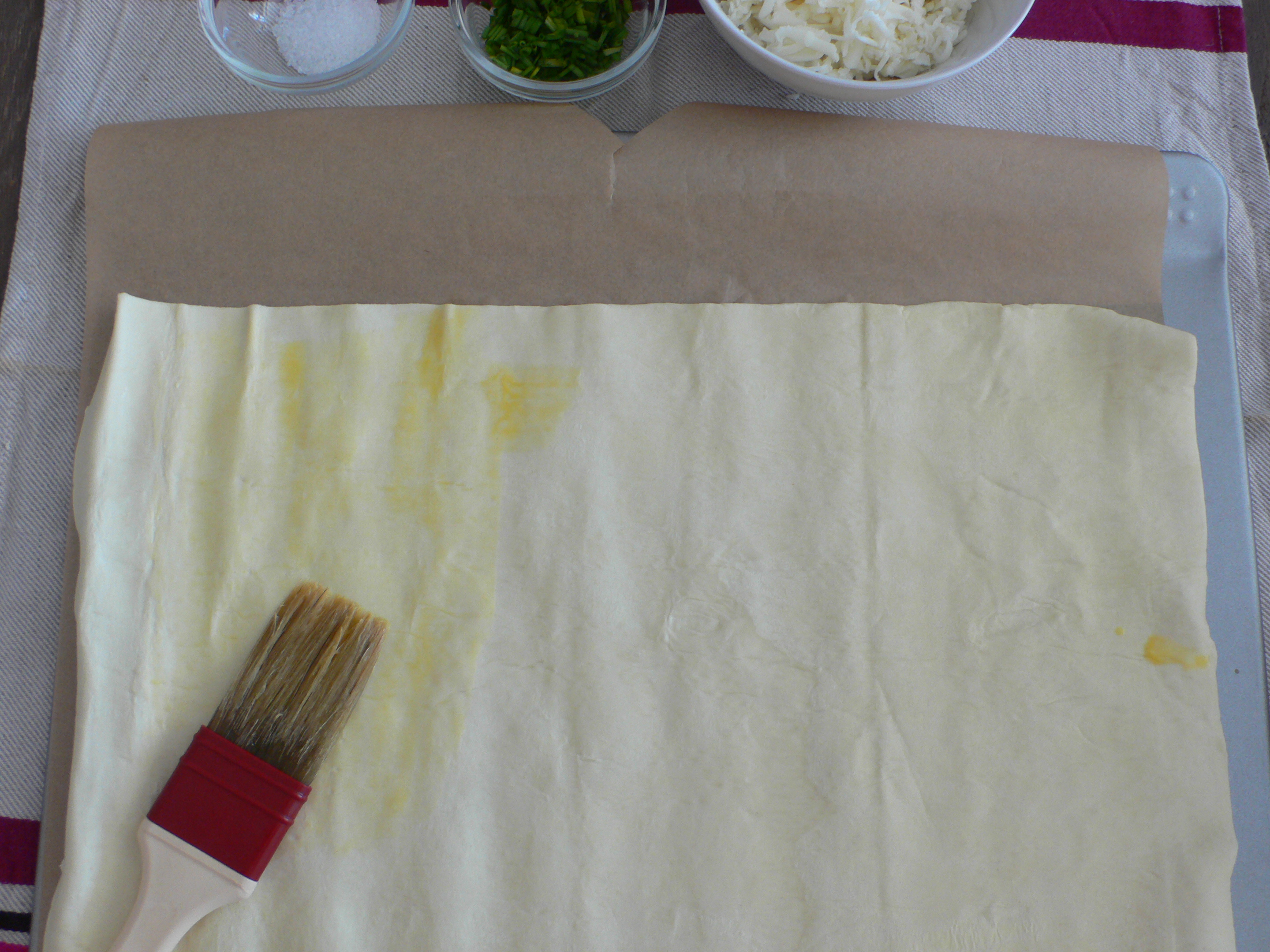 Lo primero, encender el horno a 190ºC. Y luego es tan sencillo como batir el huevo junto con el agua y tabasco y «pintar» la masa de hojaldre previamente extendida: