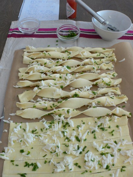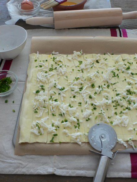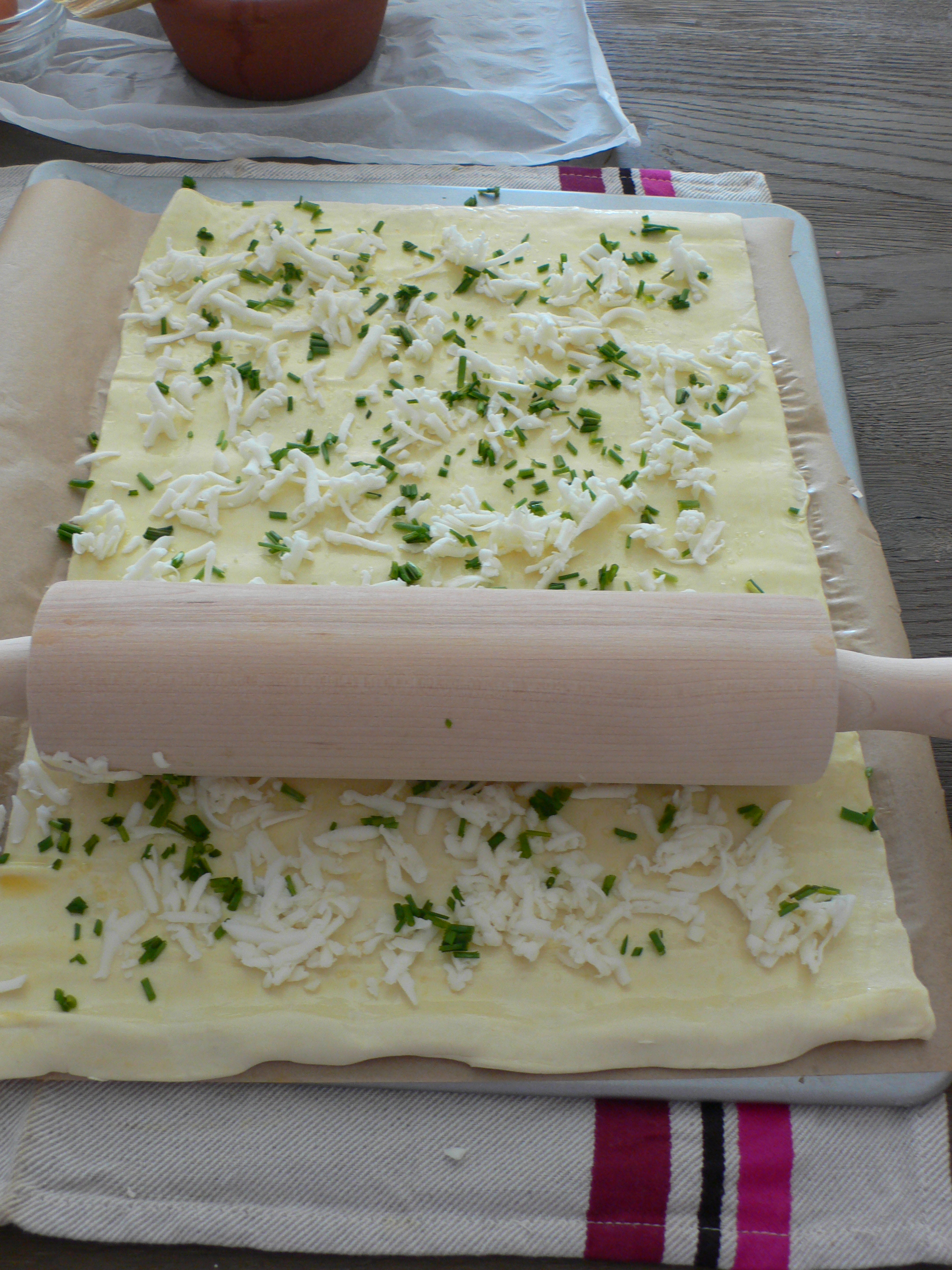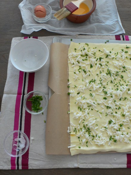 Lo siguiente es espolvorear la masa con la sal, el queso y el cebollino:
