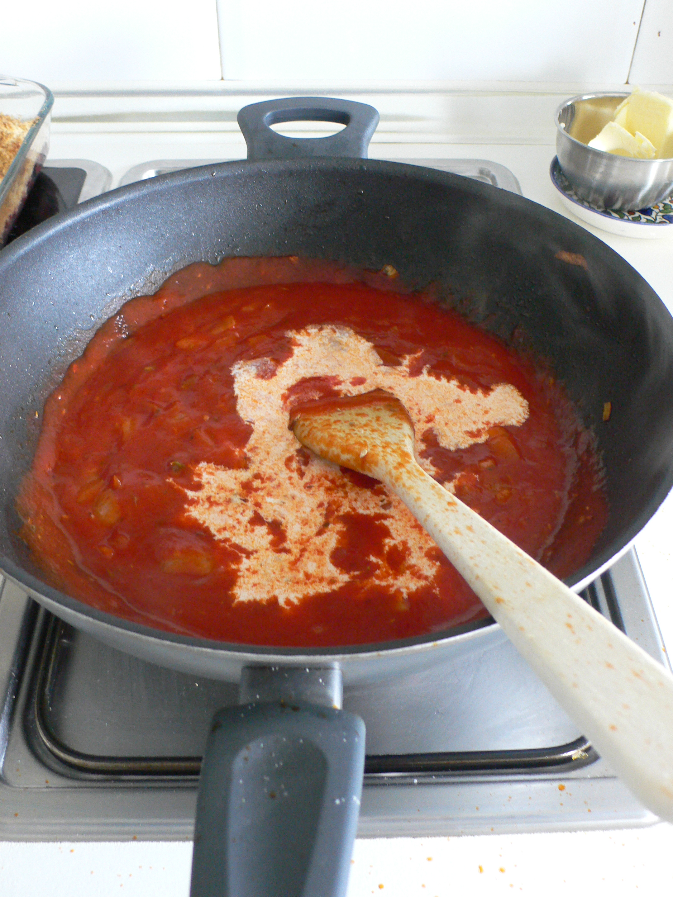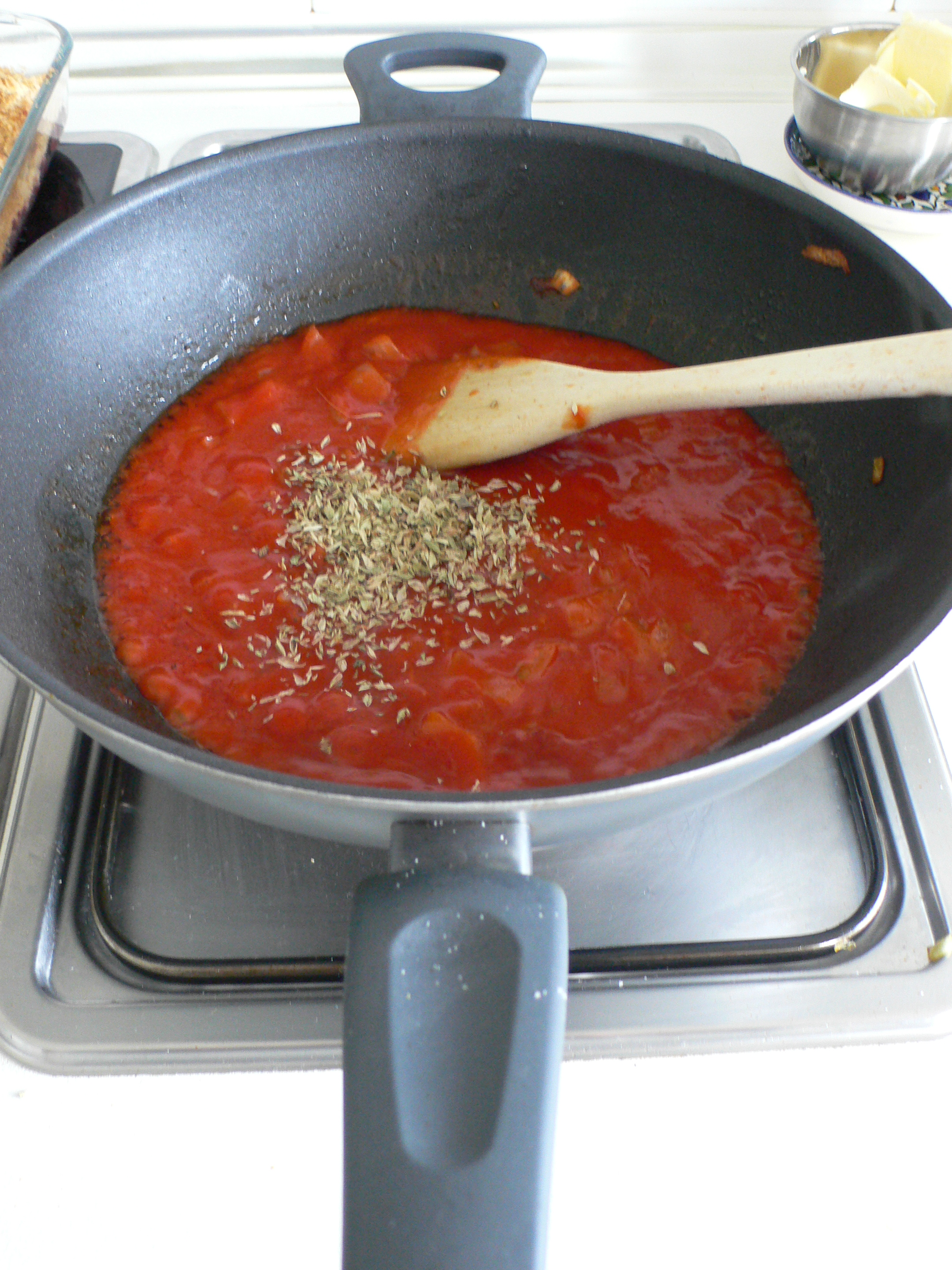Le añadimos el tomate frito y orégano y lo dejamos cocinar a fuego lento durante 5 minutos largos: