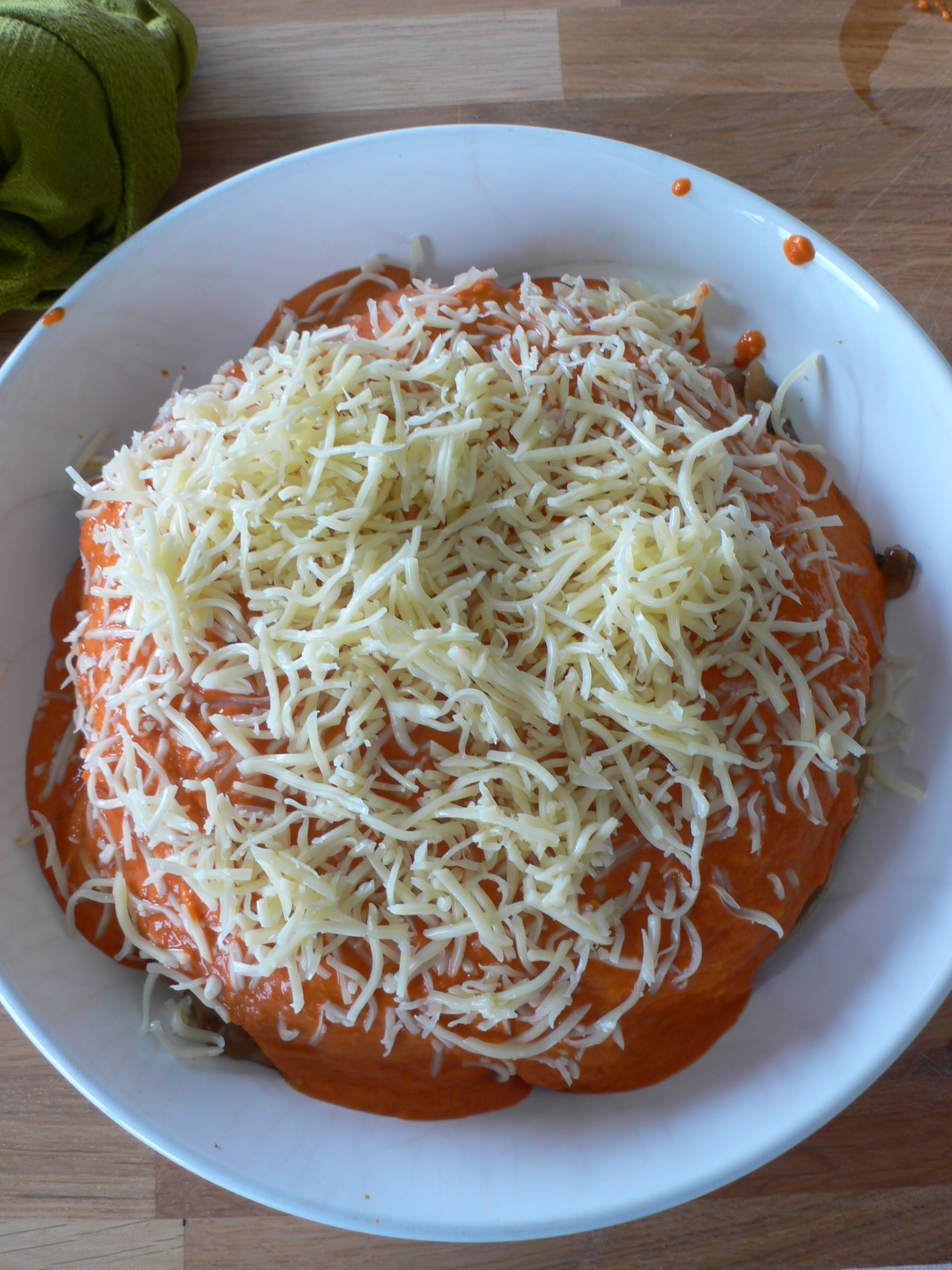 Lo primero, encender el horno a 170ºC. Y luego es tan simple como hacer capas con los ingredientes que hayamos elegido, empezando con la salsa: