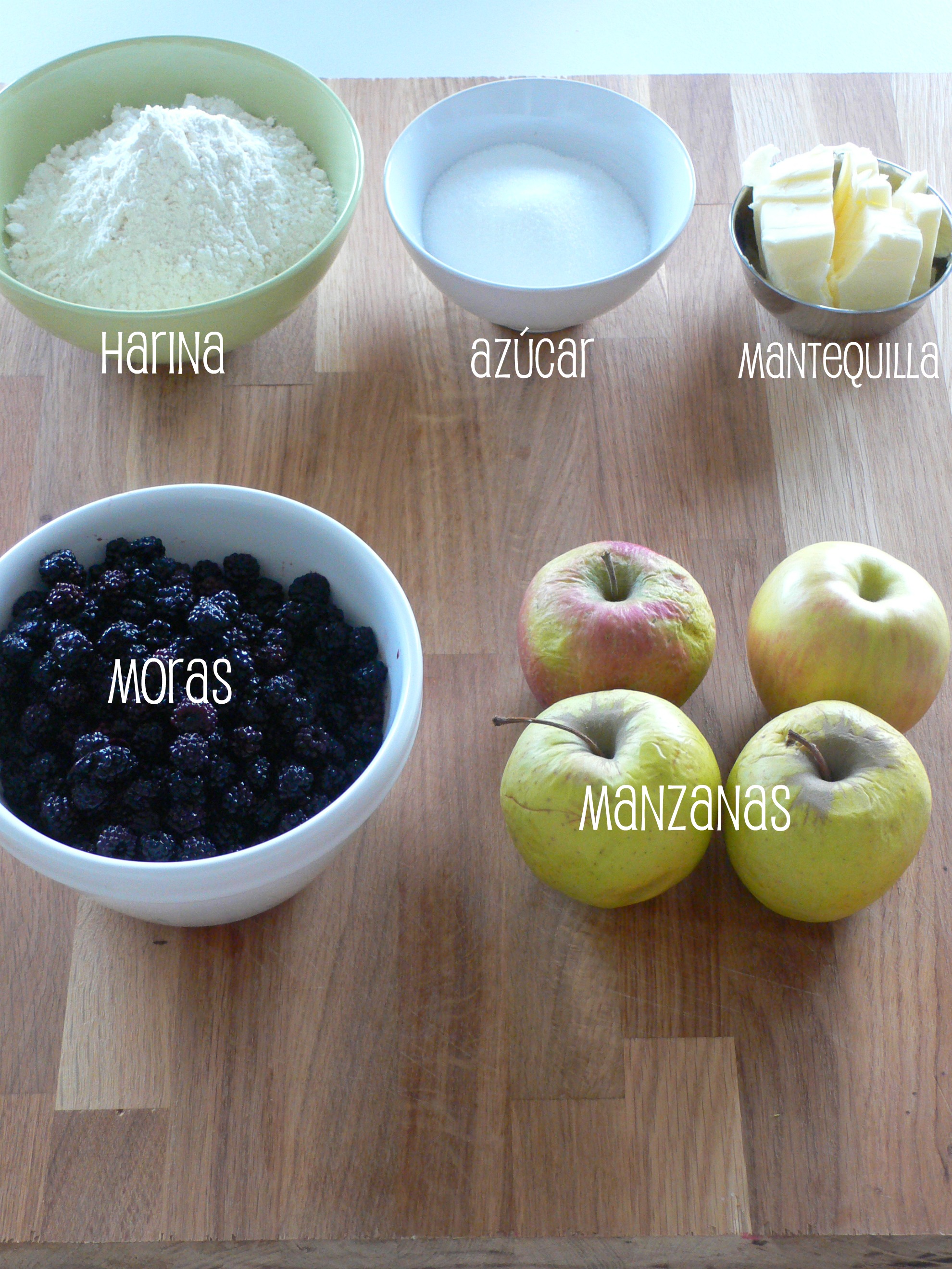 En este caso es de manzanas con moras pero se puede hacer con montón de cosas: con manzanas y pasas, peras y cardamomo, nectarinas, fresas ó frutos del bosque por decir alguno. En España no venden muchos frutos del bosque o moras sin que sean carísimos por lo que comprarlos congelados son una buena opción mucho más económica..aunque la más barata es mandar a Mr. Grumpster al campo.