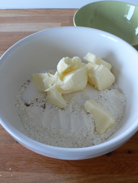 Lo dejamos reservado y preparamos el crumble. Consiste en mezclar (con las manos es la opción más rápida y fácil) la harina con el azúcar y la mantequilla: