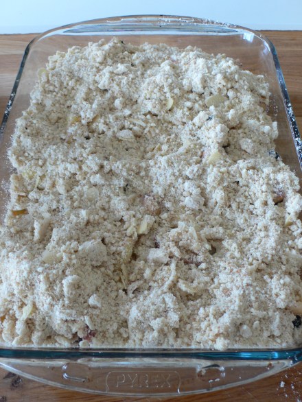 Y ahora es tan sencillo como cubrir la fruta con la mezcla por encima…si por casualidad os sobra algo de la masa del crumble, lo podéis congelar perfectamente: