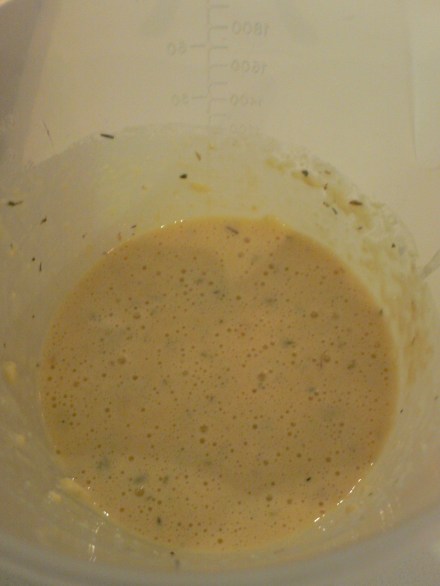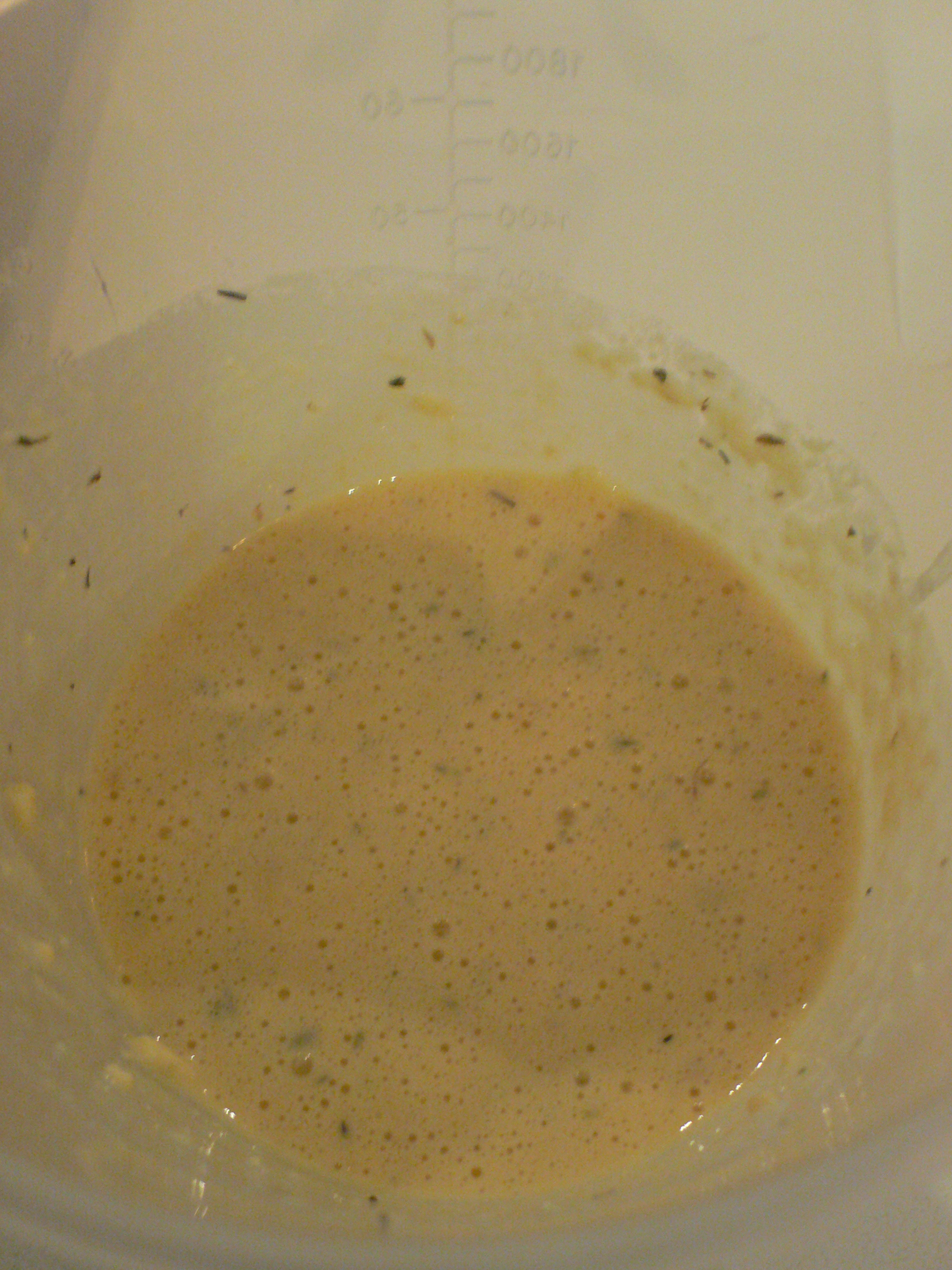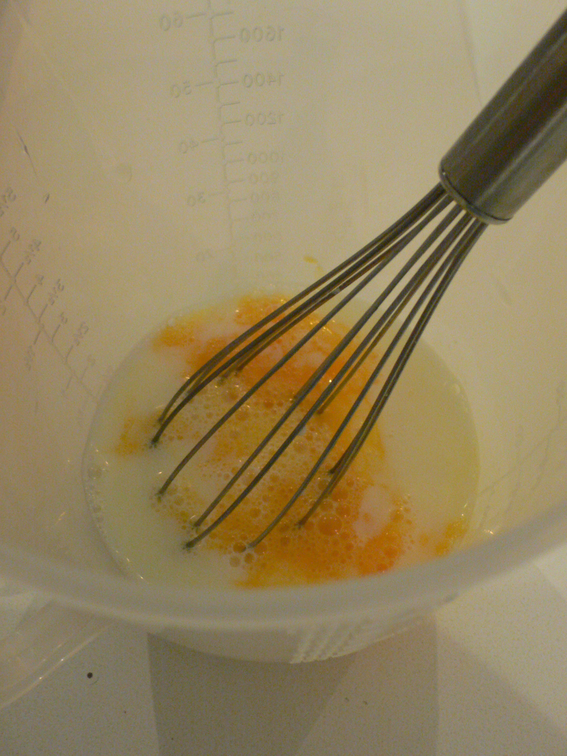 Como siempre lo primero encender el horno a 170ºC y ahora es cuestión de mezclar los ingredientes bien, empezando por la leche y huevos:
