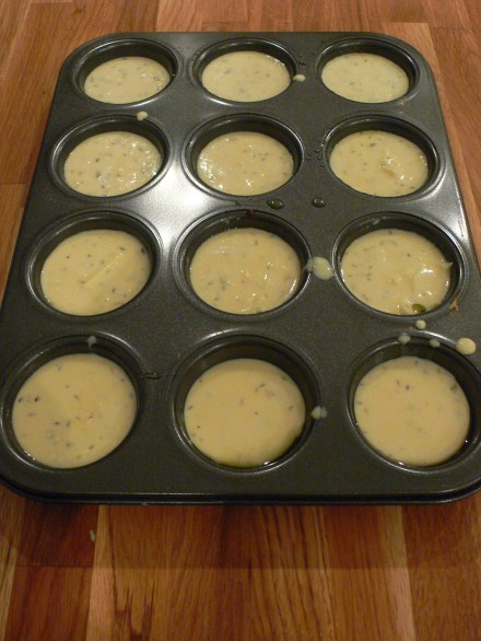 Y ahora lo tenéis que poner en un molde de muffins previamente engrasado con aceite de oliva….vale, antes de que os quejéis diciendo que no tenéis uno de esos, la alternativa es verter la masa en una fuente de horno mediana/grandecita previamente engrasada..lo único que al final tendréis que cortalo: