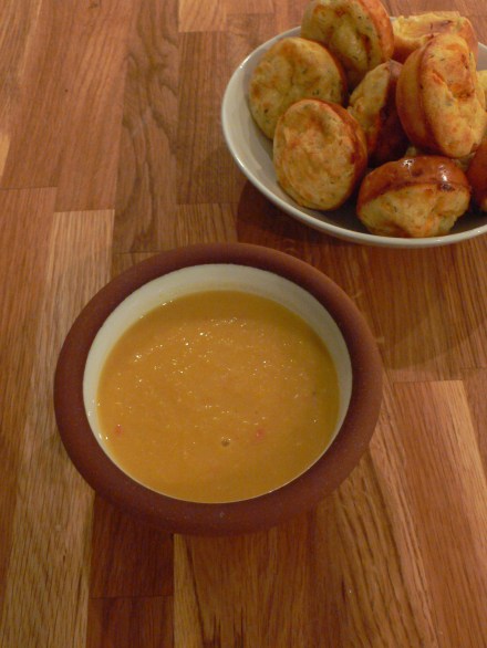 Se tarda en preparar todo unos 20 minutos en total, de los cuales 15 minutos son los que tardan en cocinarse. Es una alternativa excelente al pan por si os queréis tomar una sopa calentita, como fue mi caso. Me daba una pereza mortal cocinar y tenía congelada una crema de calabaza con chili, gengibre y crema de cacahuete (muy asiática) de la que ya os pasaré la receta porque no es por nada pero a los chicos les encanta. Debe ser por el chili pero de verdad que está buenísima y yo no es que sea una amante de lo que pica…me gusta lo justo.