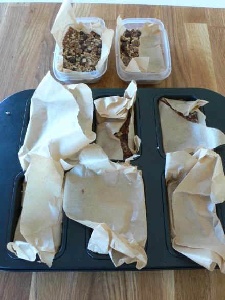 Y ahora lo ponéis en una fuente cubierta con papel de horno. Yo empecé a hacerlo hasta que me acordé que tengo un molde con rectángulos que me vendría estupendamente…otra opción es ponerlo en tapers pequeños del tamaño de una barra energética: