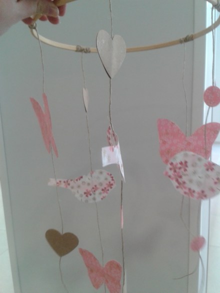Y luego hicimos un móvil para una cuna…para los que no sepáis que es eso es lo que se pone encima de la cuna para que los bebés se queden con cara de concentrados mirando lo que cuelga encima de su cabeza…el mío se lo hice a súper Cordelia, mi compi de curro que es un solete que está esperando un bebo para dentro de nada..: