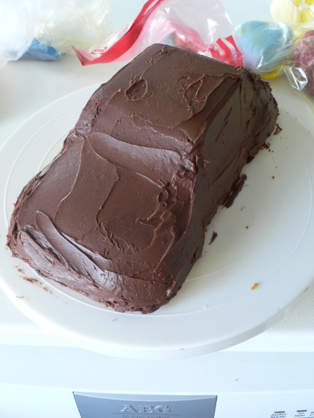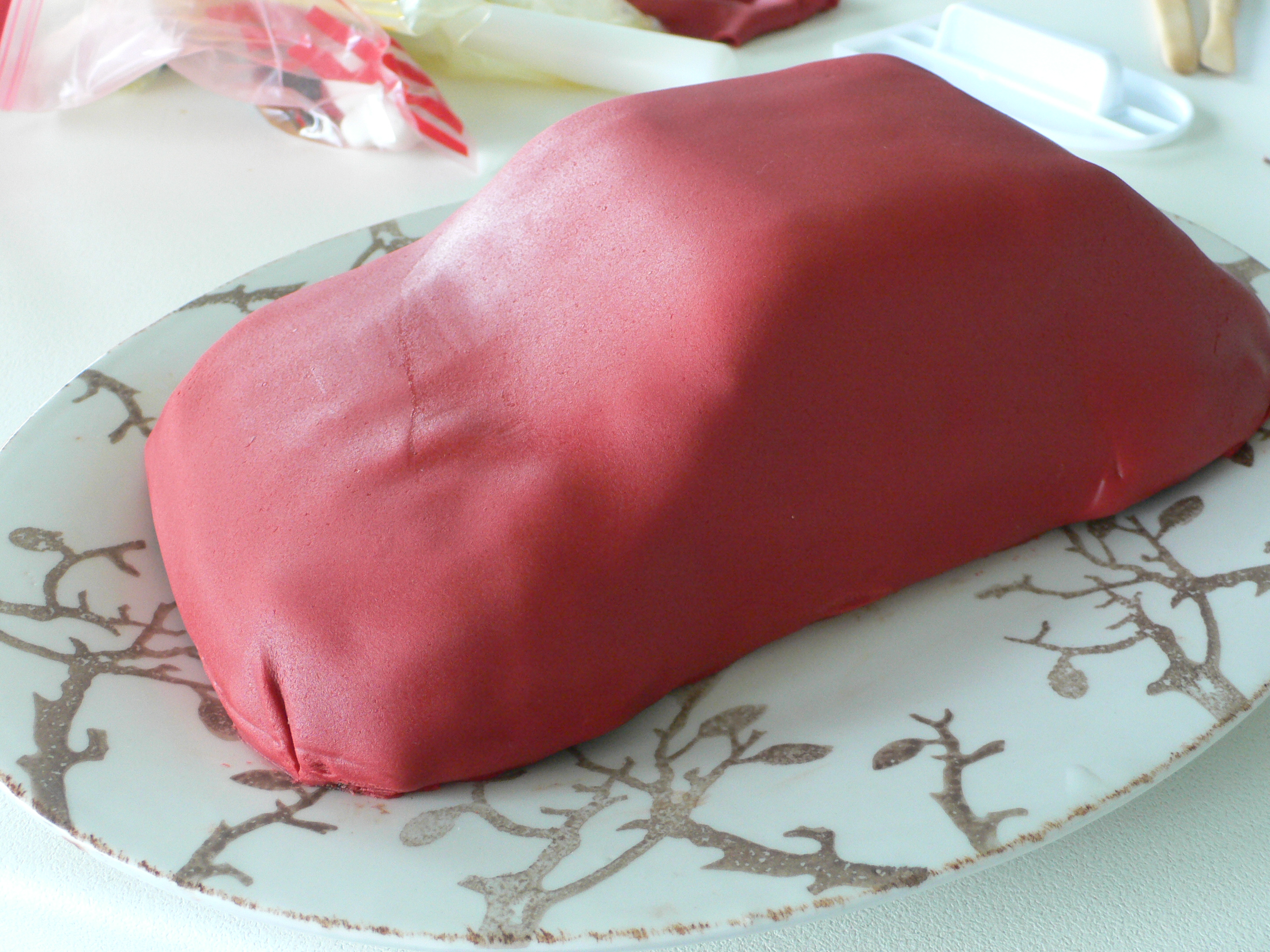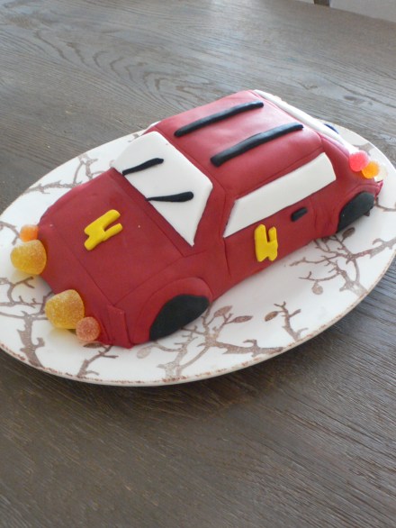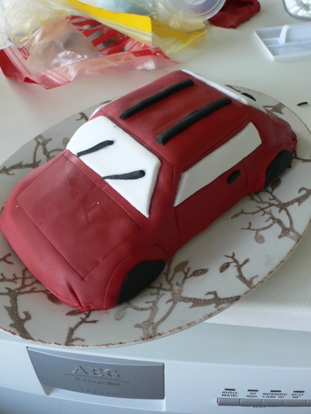 Menos mal que mi súper compi de trabajo Cordelia, me ha dejado un molde de bizcocho en forma de coche y a partir de ahí le hice a la cumpleañera su súper tarta y he de decir que no me ha quedado nada mal…de hecho mi adorable sobrino, fan número 1 del personaje en sí, me ha pedido una para su cumple…bueno, a ver qué os parece: