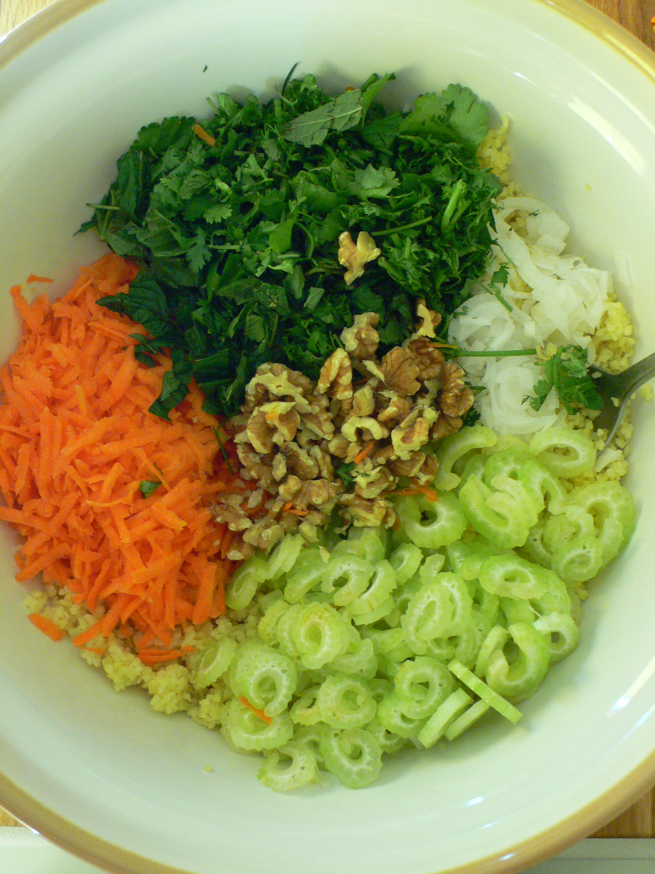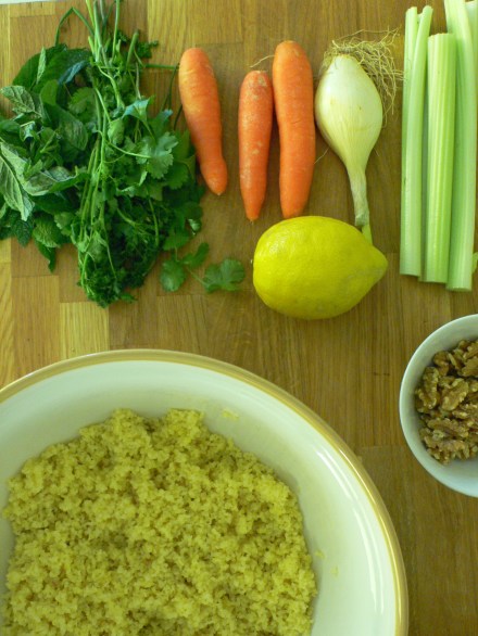 Lo primero cocinar el bulgur. Se cocina igual que el arroz: una medidad de bulgur, el doble de agua durante 10.15 minutos. Cuando esté hecho dejar enfriar. Mientras tanto cortar todo finito finito y las zanahoras rallarlas: