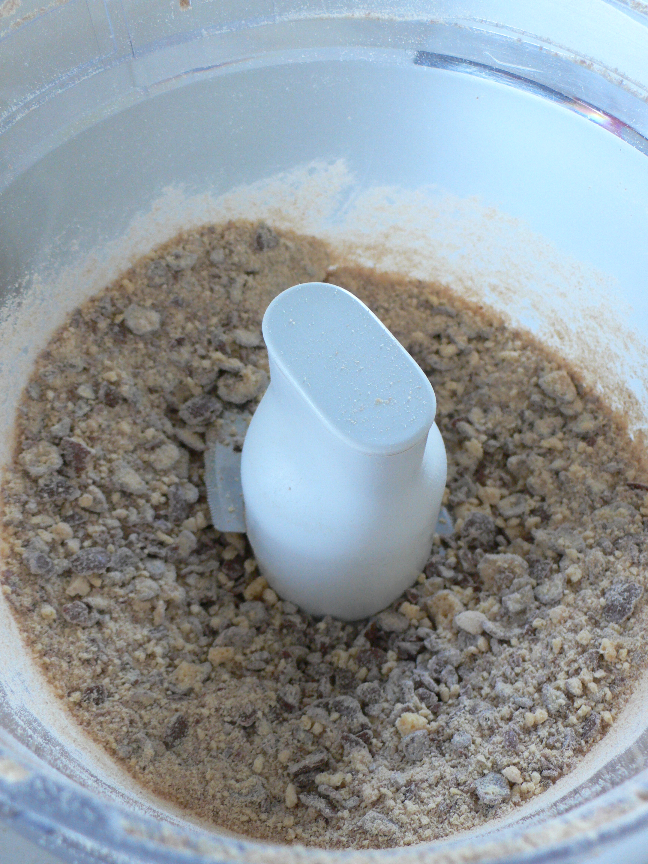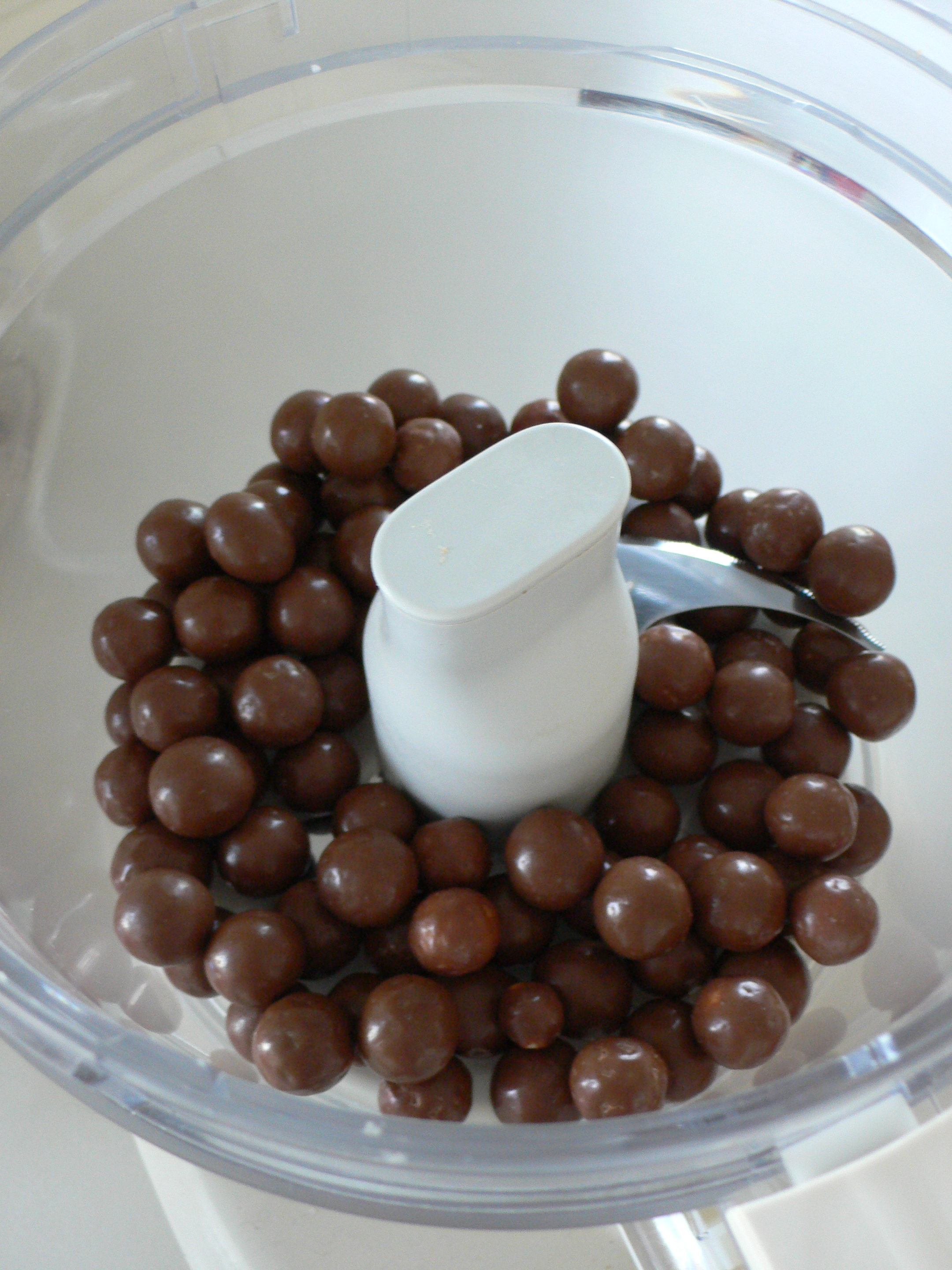 Lo primero es preparar la base crujiente de Maltesers: poner unos 200 gramos en el robot de cocina. Si no tenéis robot, meterlos en una bola de plástico y coger una maza y a desahogarse dando golpes: