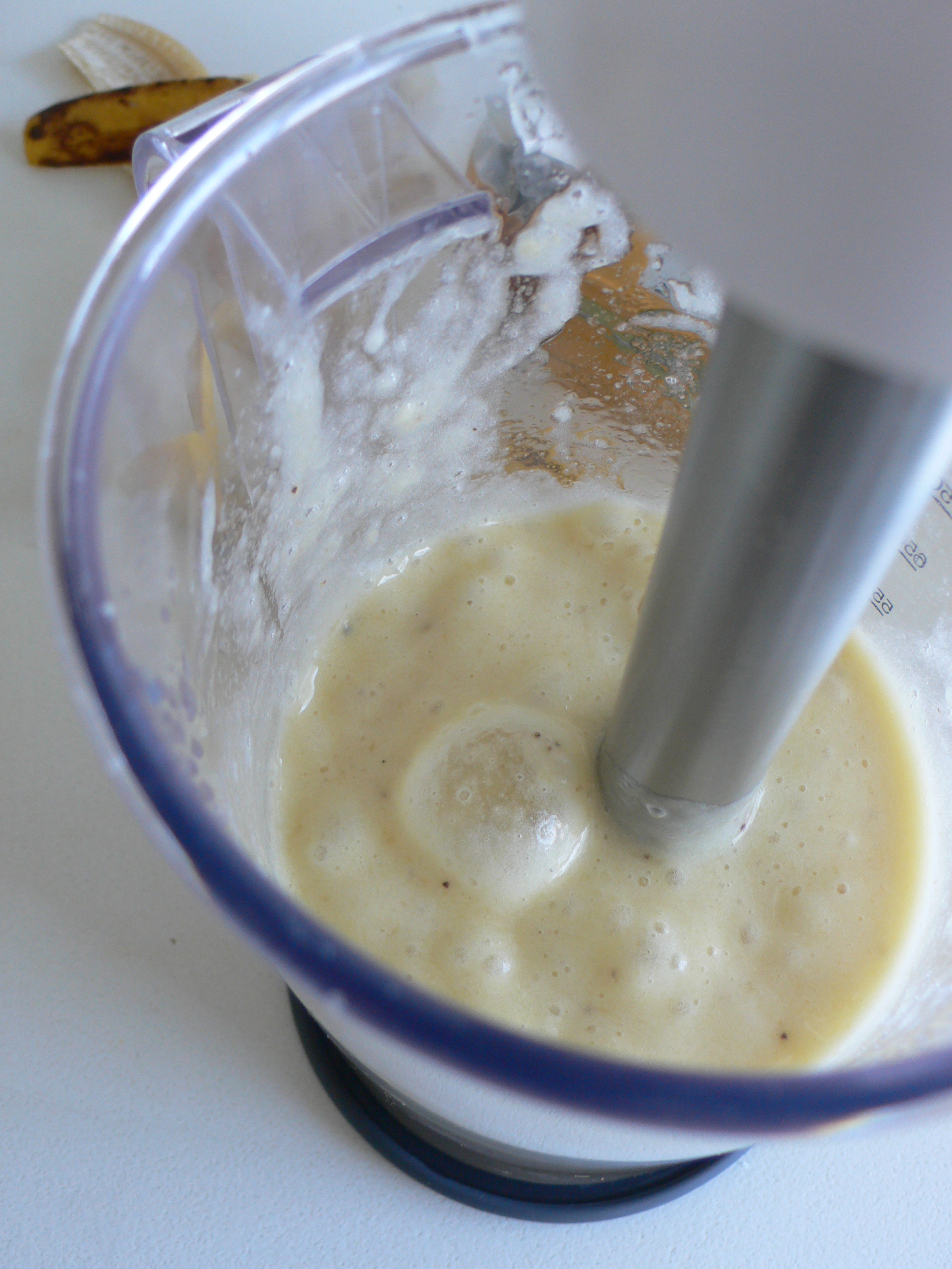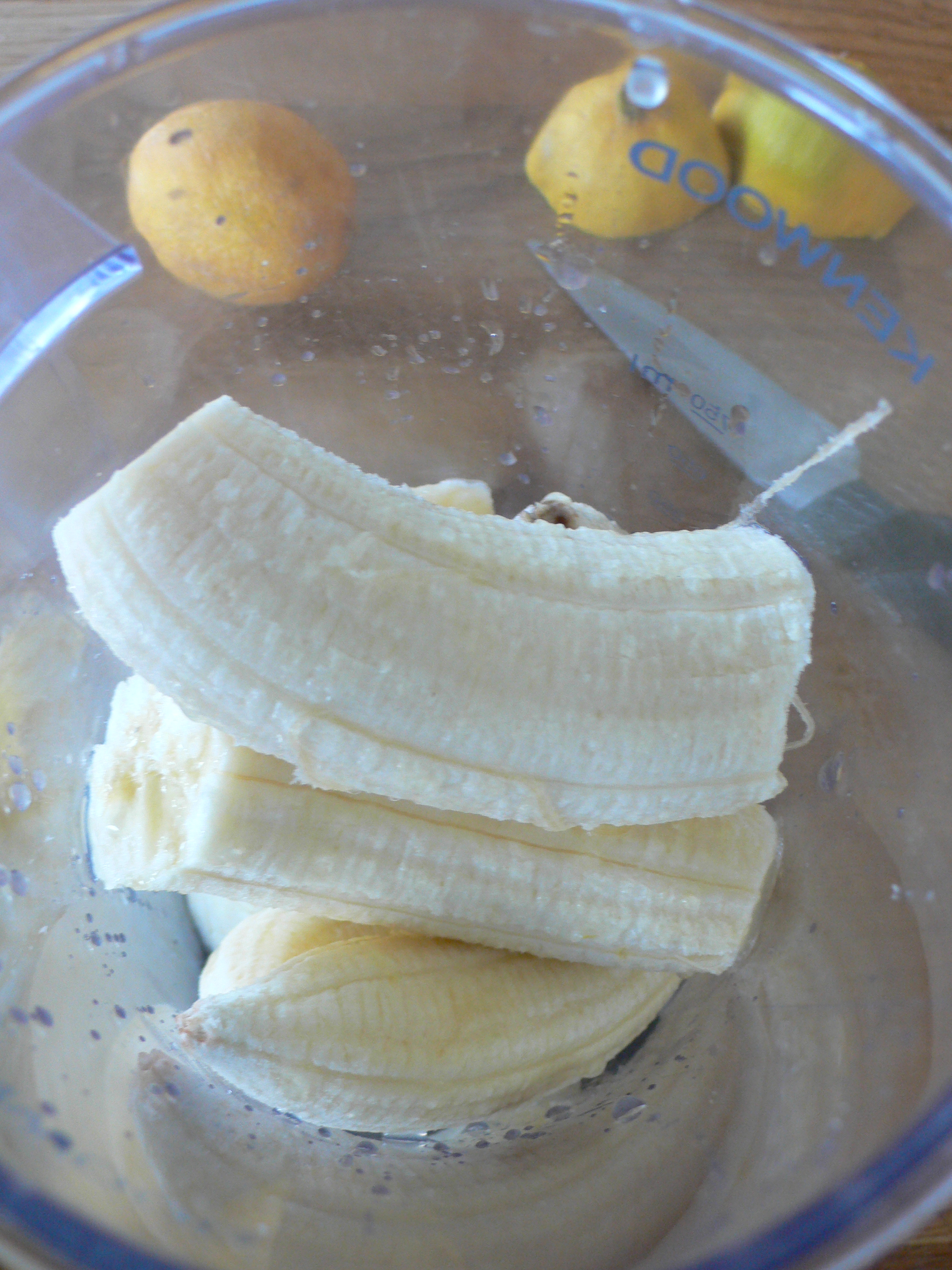 Y ahora la mousse de plátano. Lo primero hacer un puré de plátano con los plátanos y el zumo de un limón: