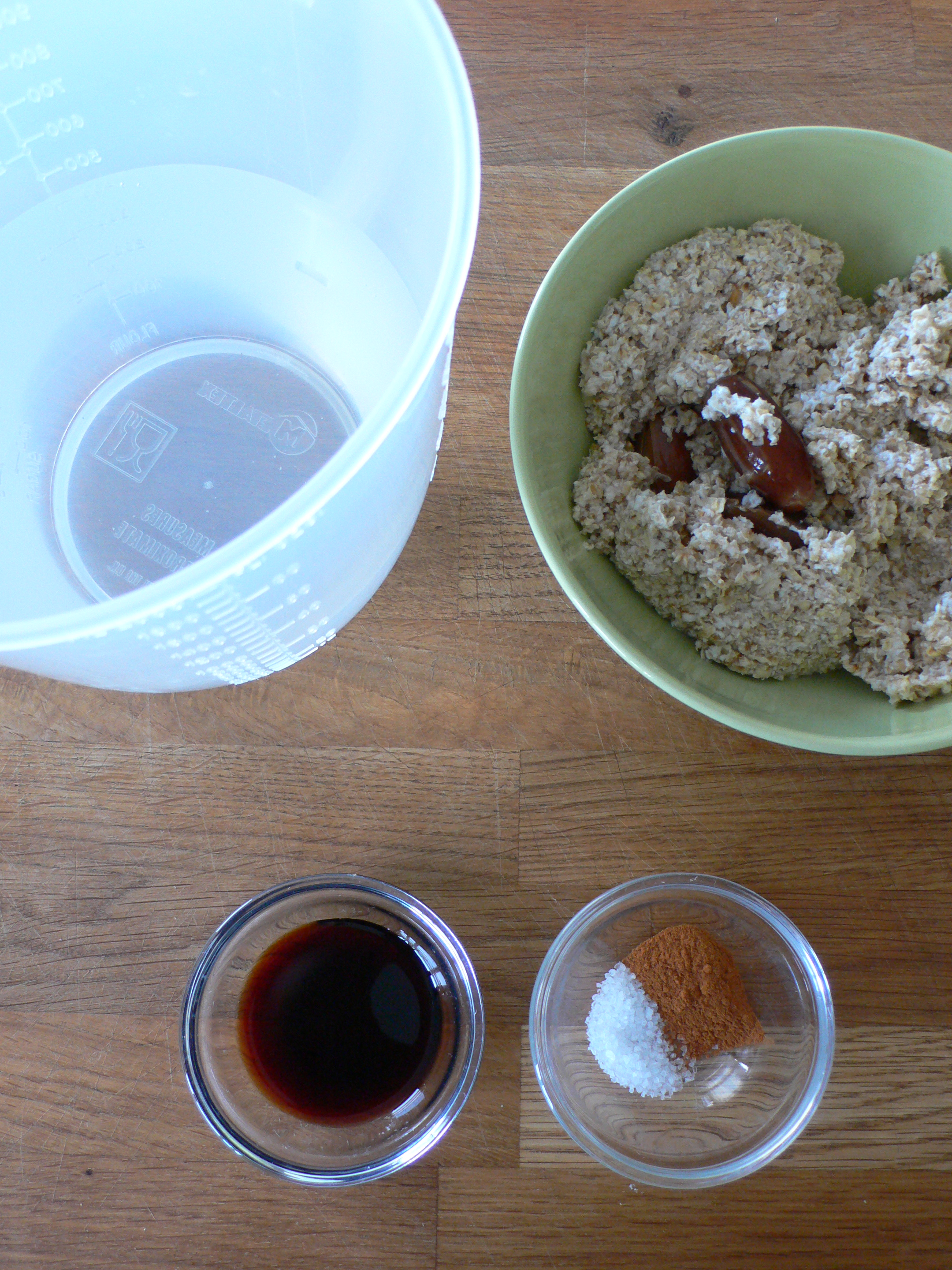 - 1 taza de avena previamente remojada y limpia (preferiblemente la que es más grande…no la de porridge que es la que he usado yo pero es que no tenía otra)
