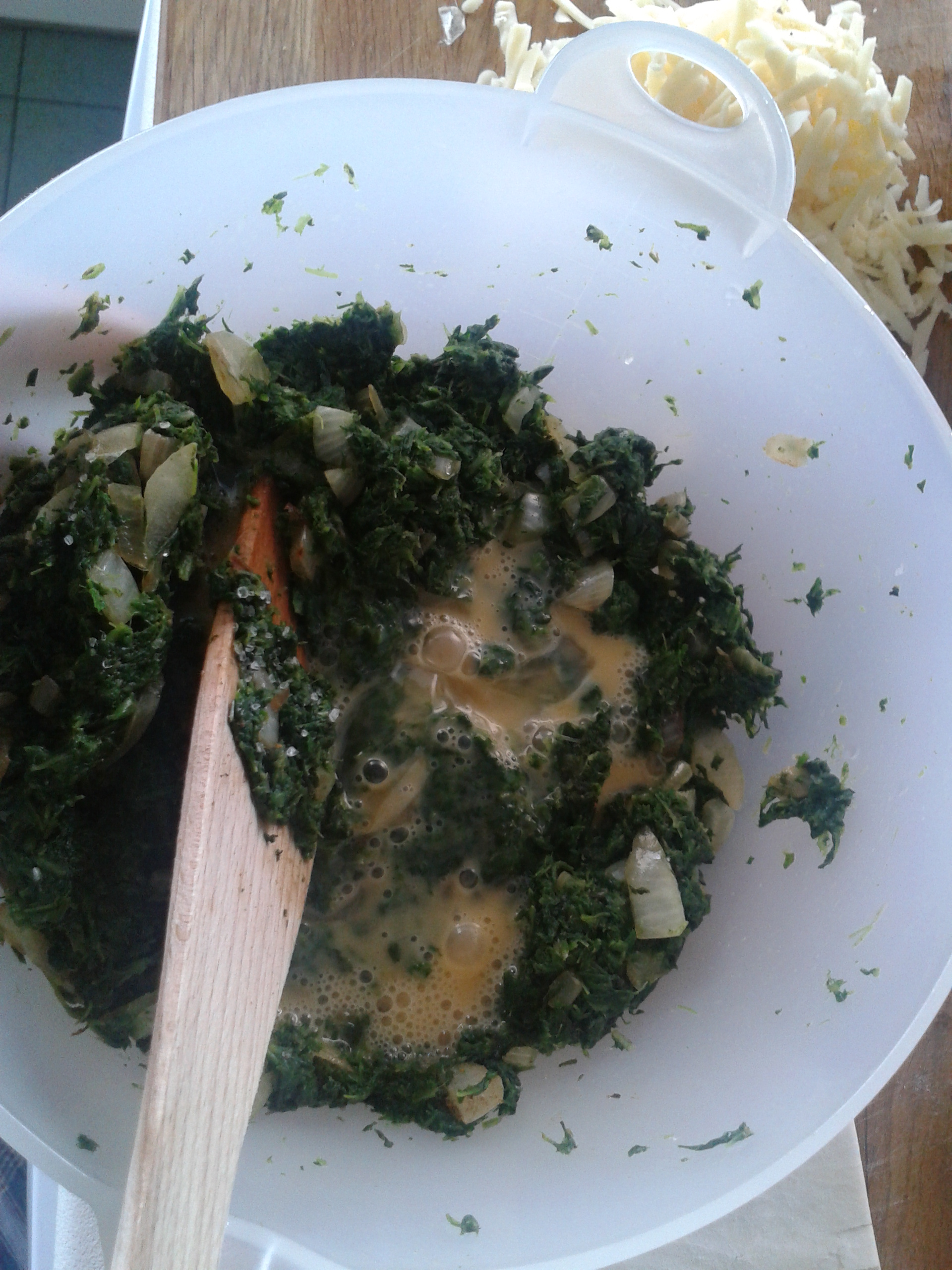 Y luego le añadimos los 2 huevos previamente batidos (a los que les he añadido un poco del líquido del jengibre) y mezclamos otra vez:
