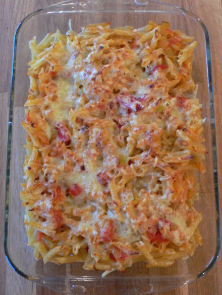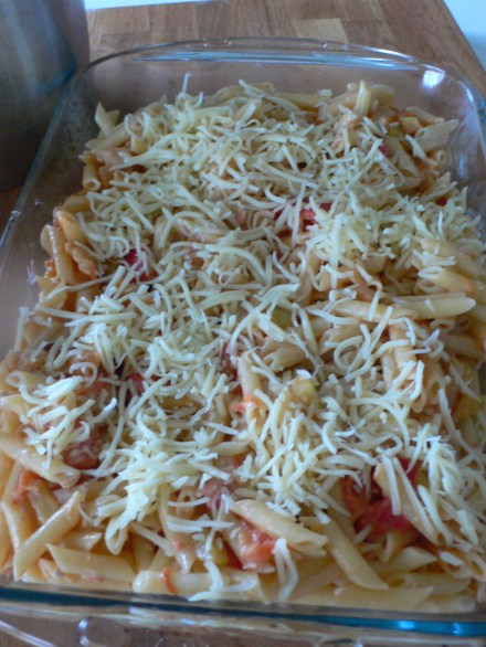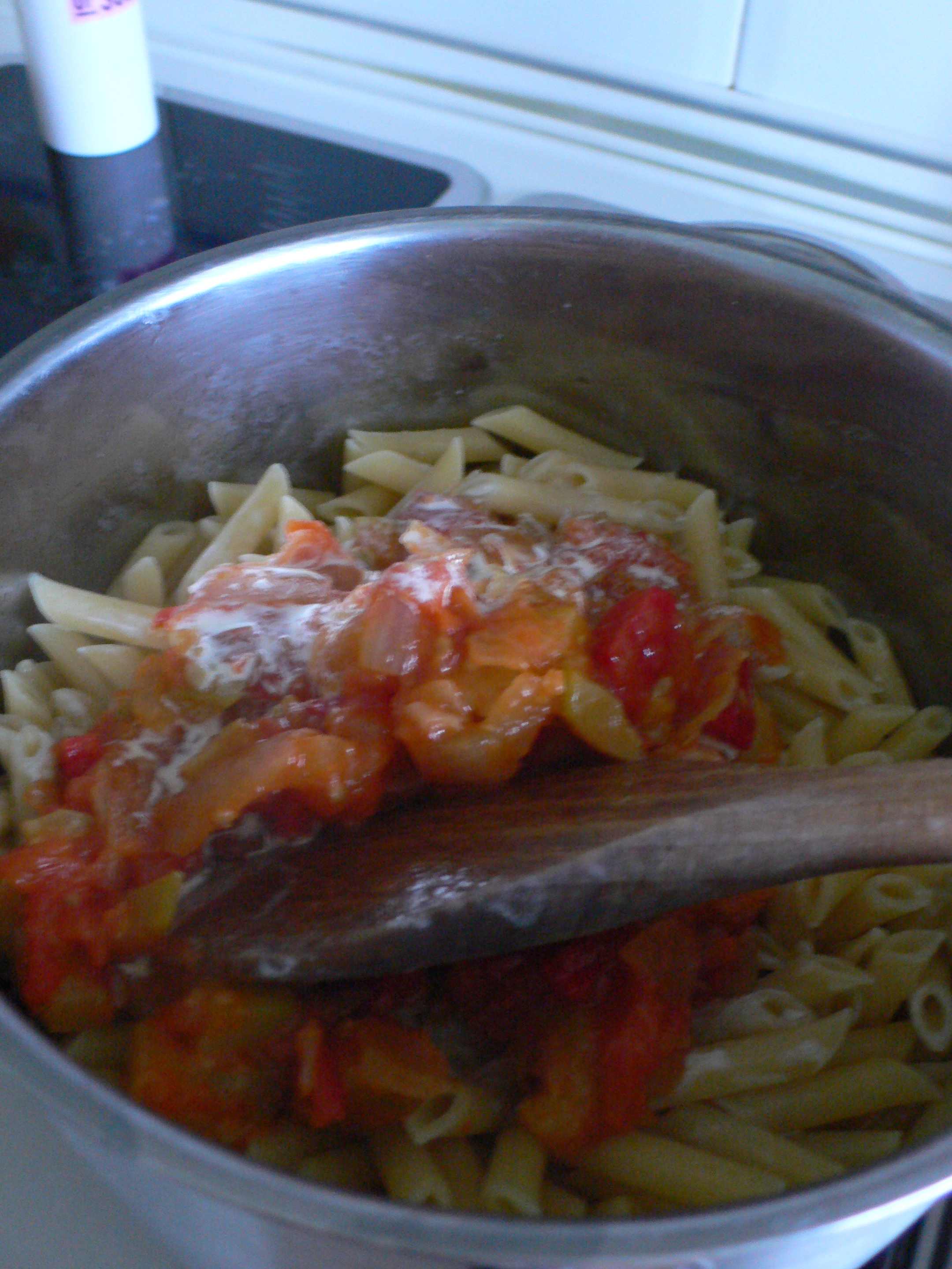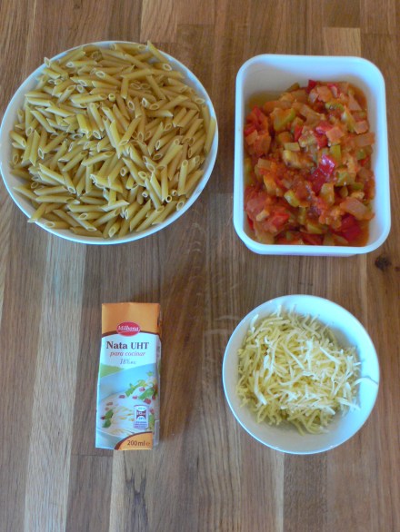Así que busqué restos en la nevera y me encontré con un resto de pisto, queso rallado y nata…así que hice macarrones con pisto…que en el fondo es macarrones con verduras…sé que no es nada del otro mundo y que la razón por la que la he hecho es para salir un poco (bastante) del paso pero la idea es demostraros que con unos restos se puede hacer una cena de lo más apetecible.