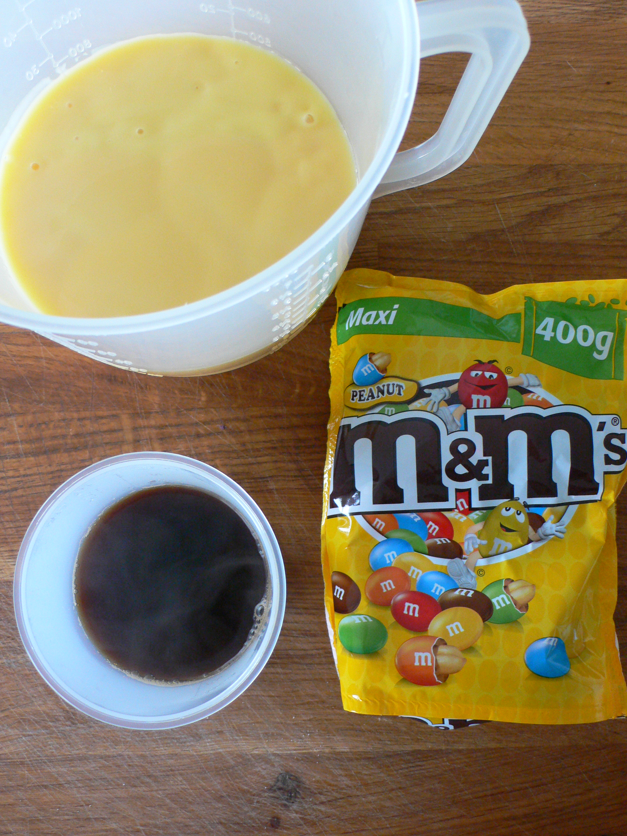 Así que pensé que helado de café con M&M´s rellenos de cacahuete podía ser una combinación estupenda. Sólo os hacen falta 3 ingredientes y un recipiente de plástico con tapa que podáis meter en el congelador: