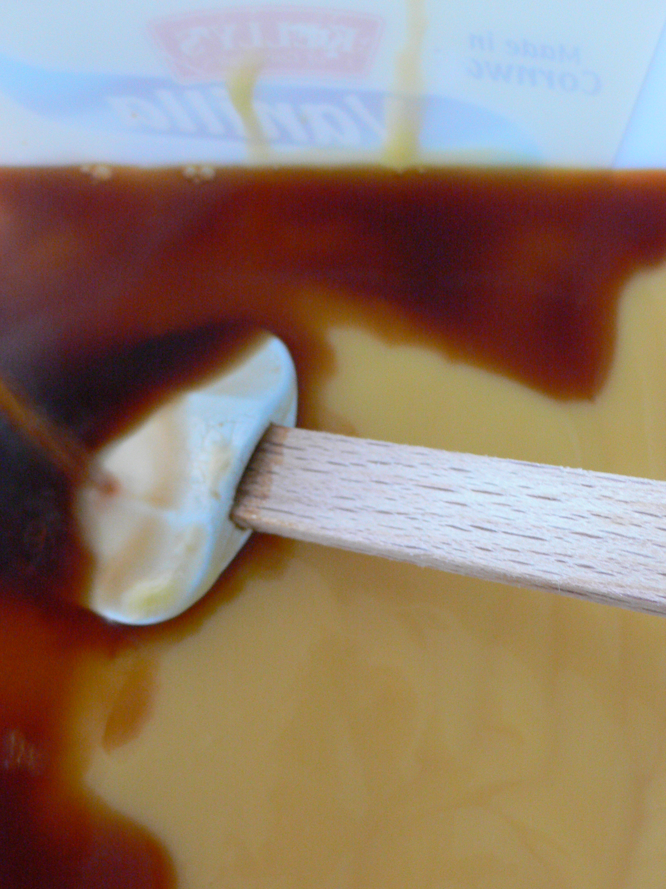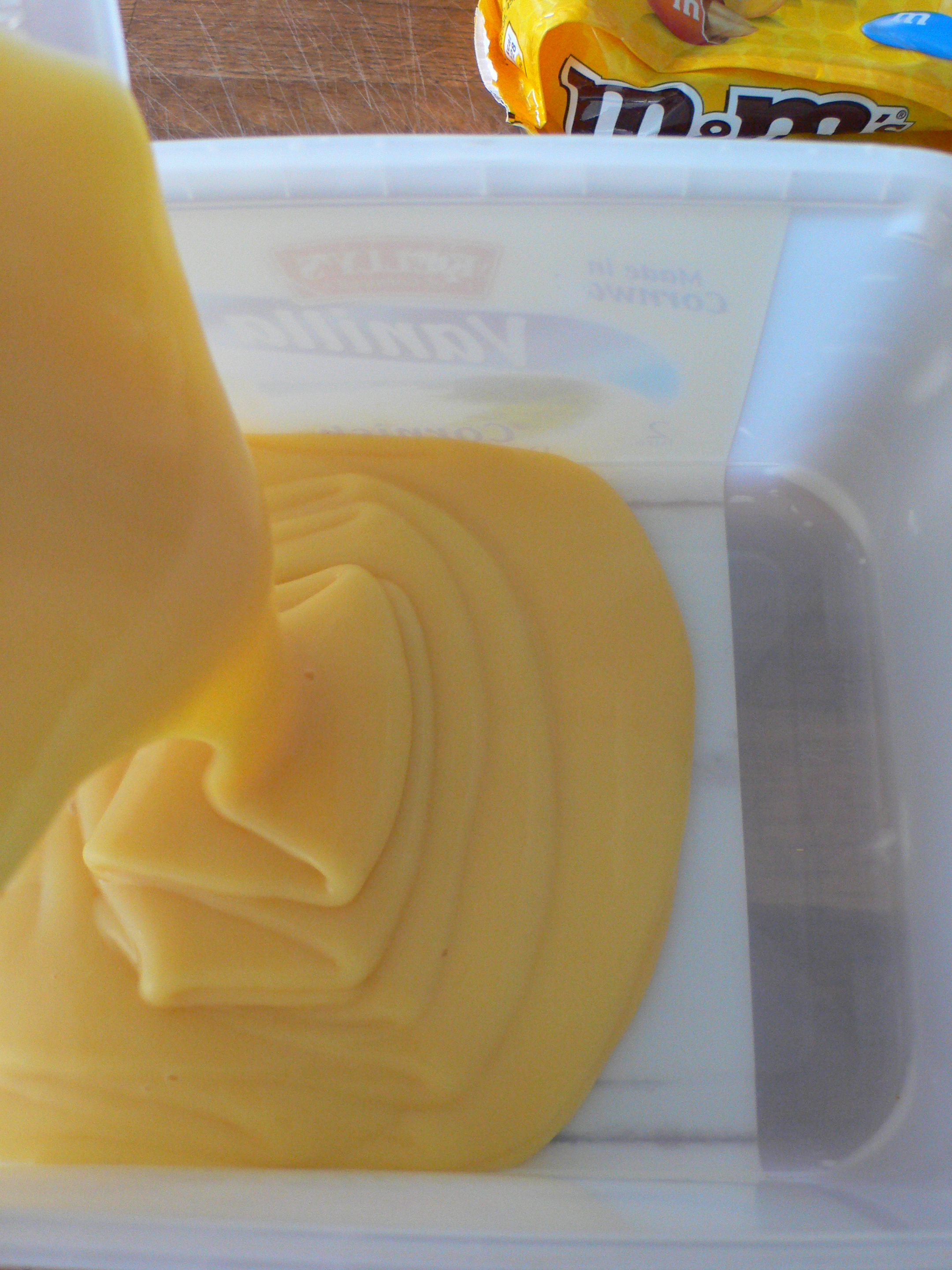 Os recomiendo que el recipiente o taper sea de 2 litros porque si no os podéis quedar cortos de espacio. Bueno pues es tan fácil como verter las natillas en el recipiente elegido ( después de hacer este helado es mejor que el contenedor sea bajo y largo en vez de más pequeño y alto porque si no va tardar mucho más en congelarse):
