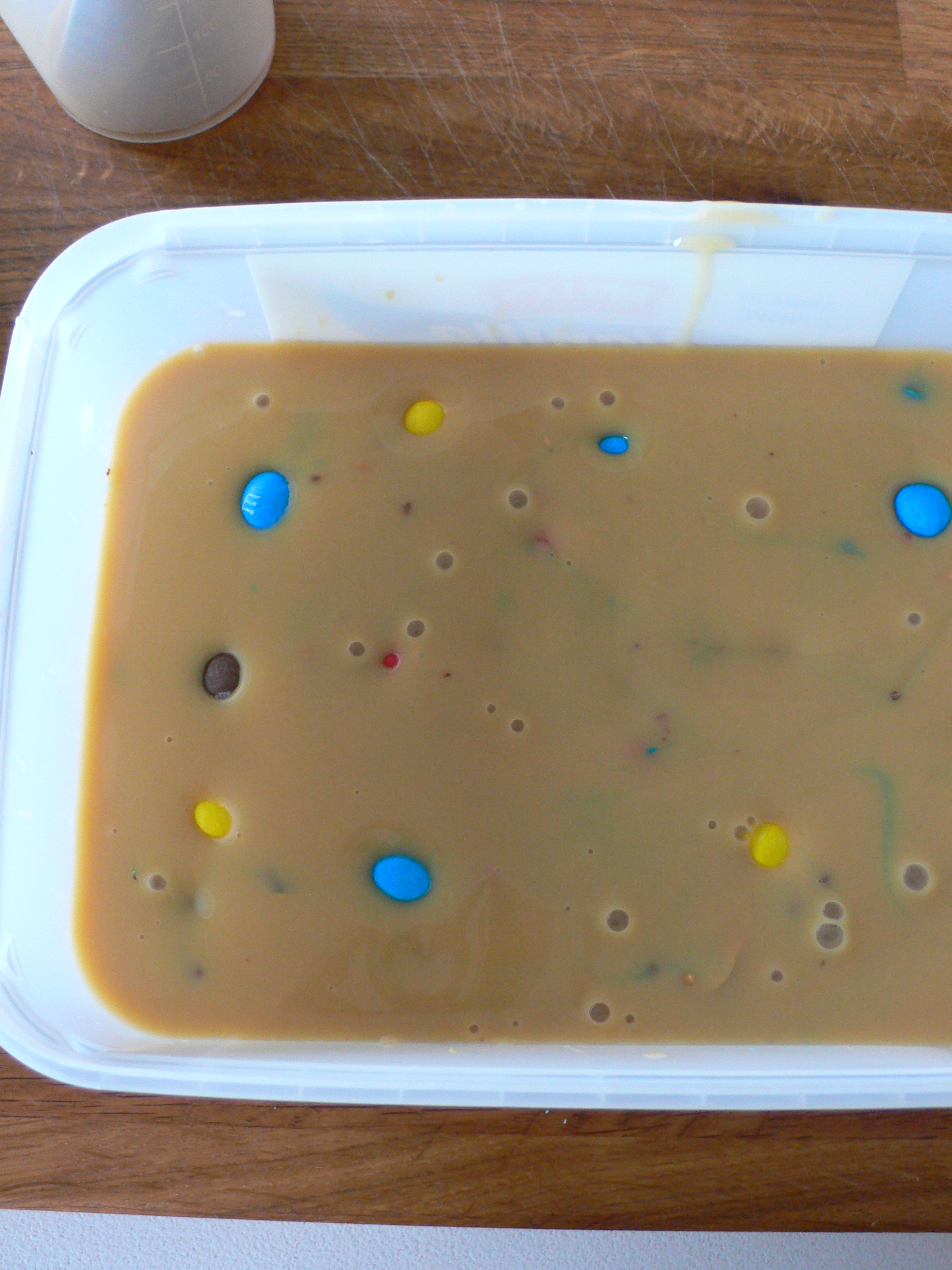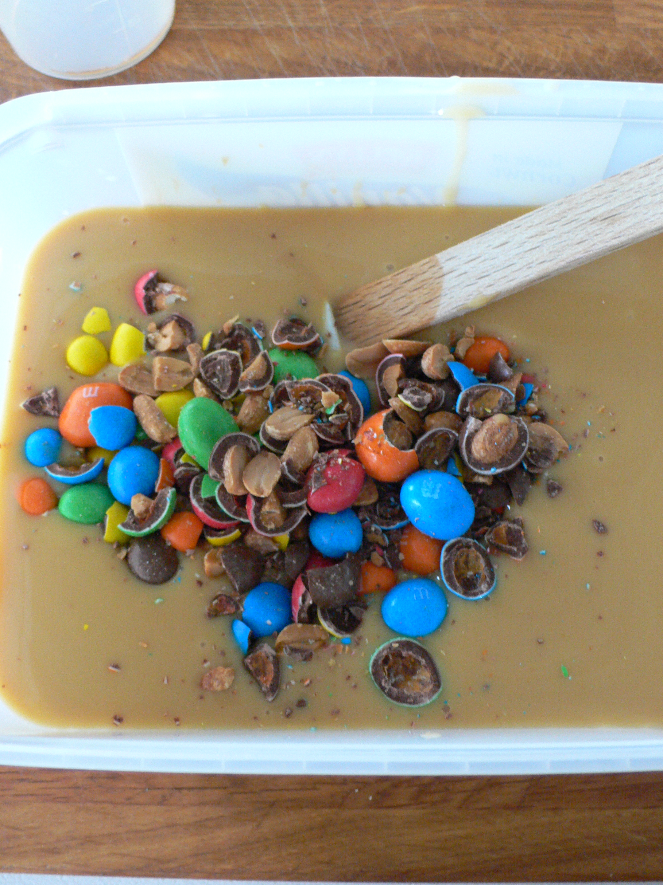 Le añadimos los M&M´s (en mi caso he partido unos cuantos de tal manera que algunos está enteros y otros no):