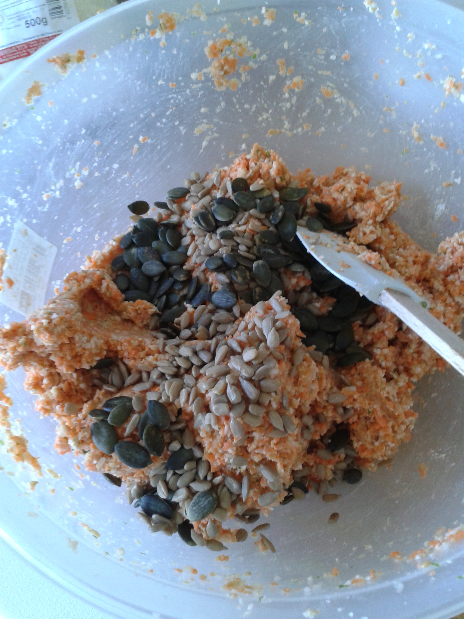 Ir mezclando y le añadís más o menos harina de tal manera que la masa no quede muy mojada pero sin pasarse…tiene que aguantar la forma. Le añadís las semillas de girasol y calabaza y mezcláis: