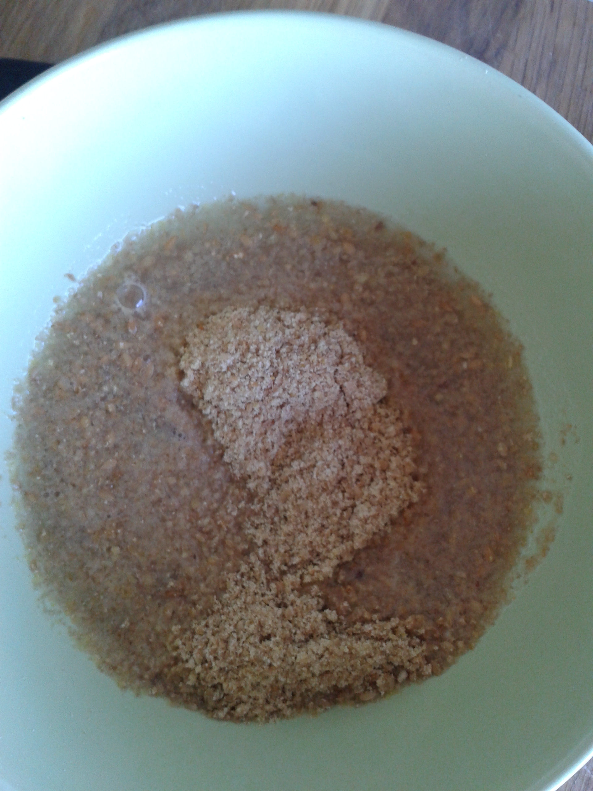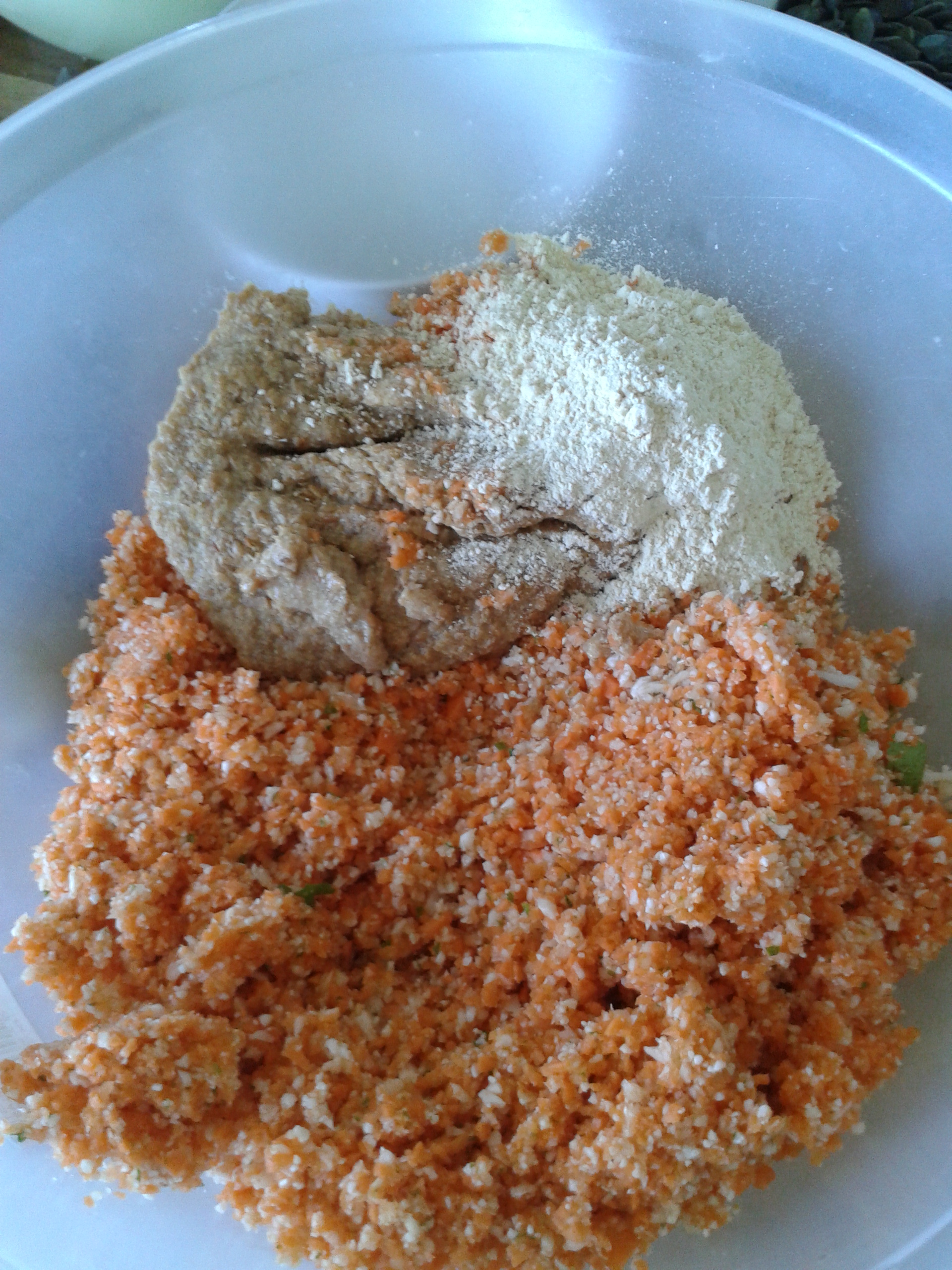El olor es increíble y os lo vais a querer comer en ese mismo momento. Ahora ponéis todo en un bowl grande y le añadís la linaza con el agua que ahora es una plasta de aspecto sospechoso y un poco de harina de garbanzo: