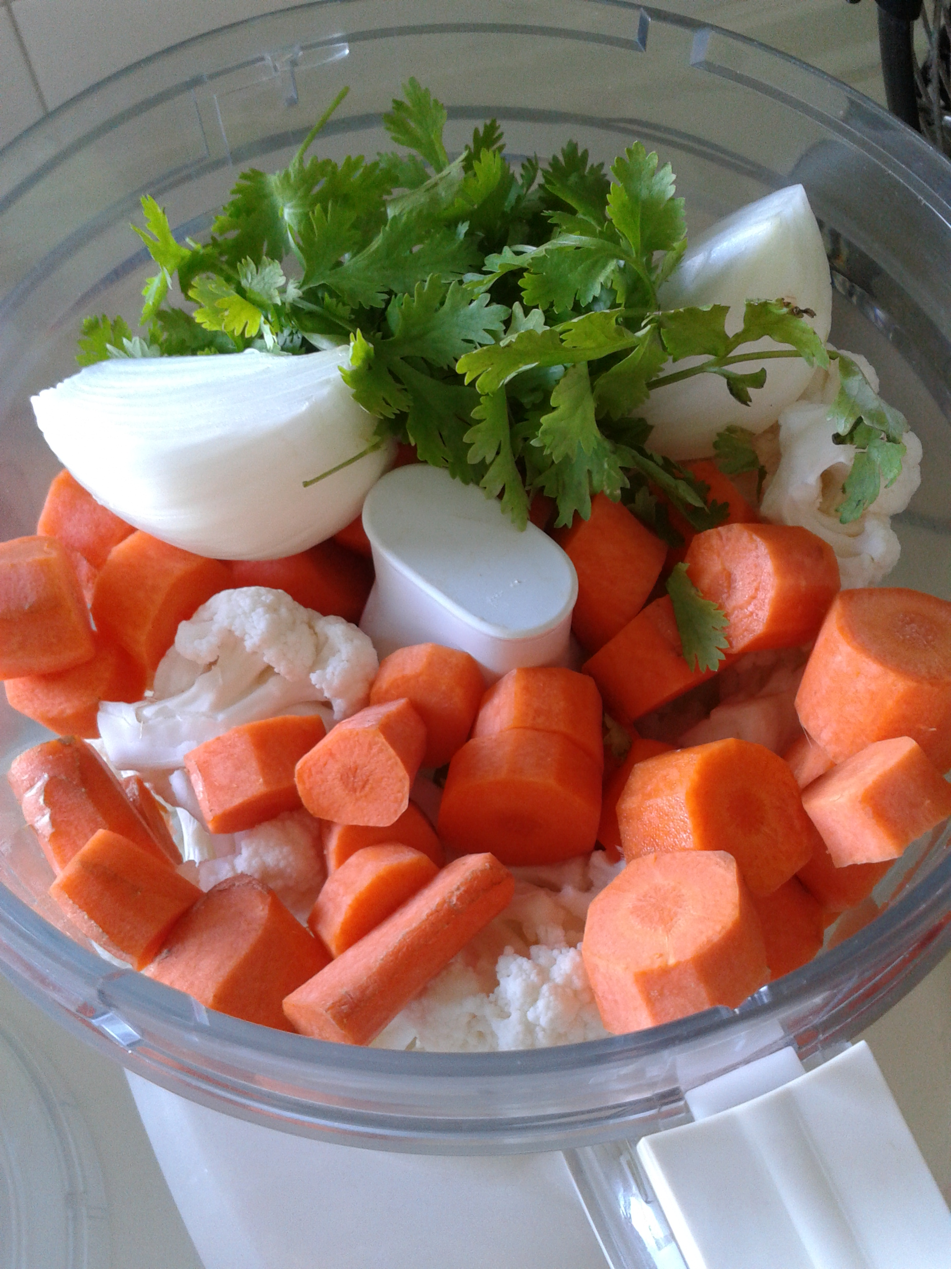 Y ahora el resto. Ahora hay que poner la coliflor, zanahoria, cebolla, cilantro y ajo en el robot de cocina y darle al botón: