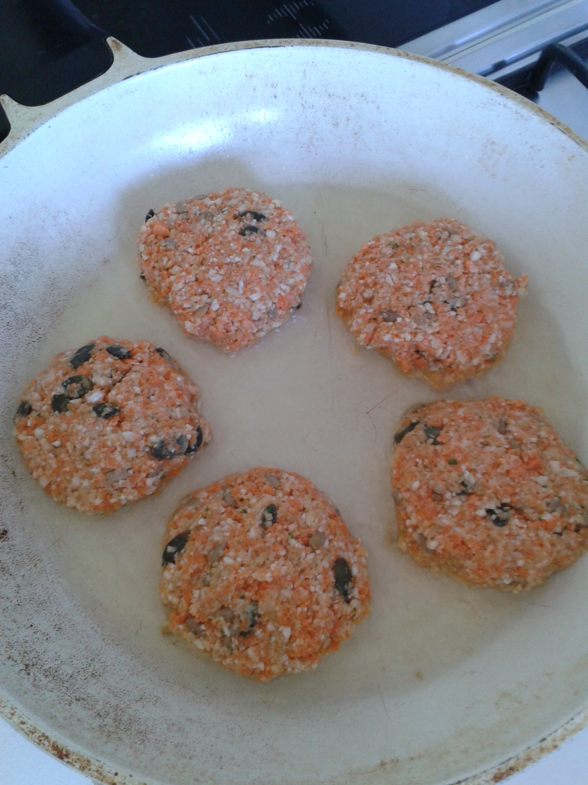 Son 100% vegetarianas y utiliza semillas de linaza como el ingrediente que une todo. Es el equivalente al huevo. He de decir que he cambiado un pelín la receta y que he duplicado las cantidades pero aparte de eso todo igual.